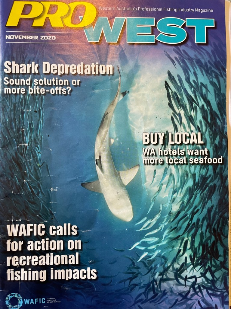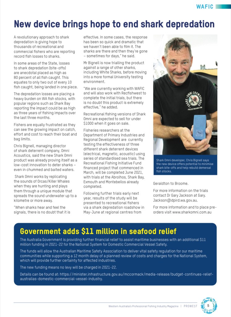 no but seriously, the latest edition of Pro West Nov ‘20 is out and a featured article on Chris and Shark Omni. We are mentioned on the cover as “Shark depredation – Sound solution or more bite offs ?” Great to have our founder in the headlines and the magazine circulates to over 100,000 fishermen in W.A.